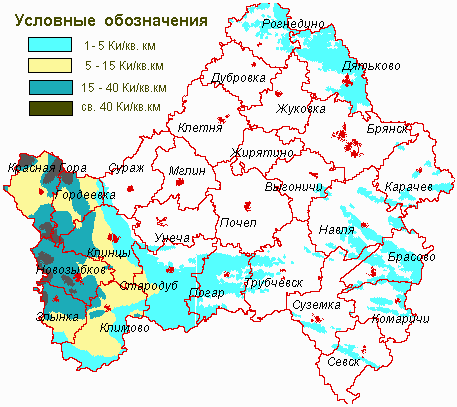 На рисунке представлена карта поверхностного загрязнения почвы Брянской области цезием-137 по состоянию на 1986 год. Наиболее радиоактивно загрязненными оказались юго-западные территории области: Гордеевский, Злынковский, Климовский, Клинцовский, Красногорский и Новозыбковский районы, г.Клинцы и г.Новозыбков. За годы, прошедшие после аварии на ЧАЭС, органами и организациями, осуществляющими санитарно-эпидемиологический надзор на территории Брянской области, выполнен большой объем работ по защите населения загрязненных территорий с целью снижения доз облучения. Но особенно следует отметить роль осуществления радиационно-гигиенического мониторинга продуктов питания с целью ограничения поступления радионуклидов в организм человека, что в результате обеспечивало снижение доз внутреннего облучения населения.